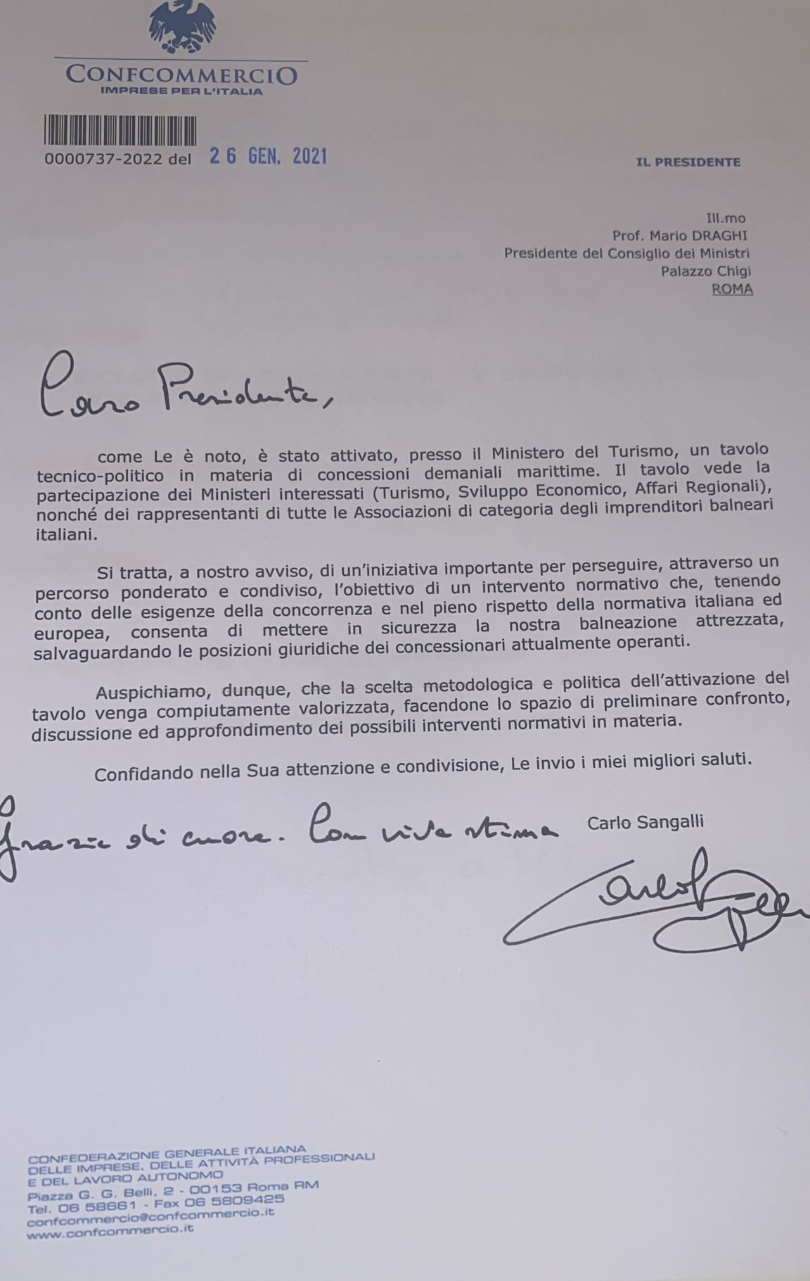 Raccogliendo una nostra sollecitazione, il Presidente nazionale di Confcommercio Carlo Sangalli ha inviato al Presidente del Consiglio dei Ministri Mario Draghi una lettera per la doverosa e opportuna valorizzazione del cd tavolo tecnico attivato dal Ministro Garavaglia affinché si giunga a una corretta applicazione della normativa europea che non penalizzi le aziende balneari attualmente operanti.