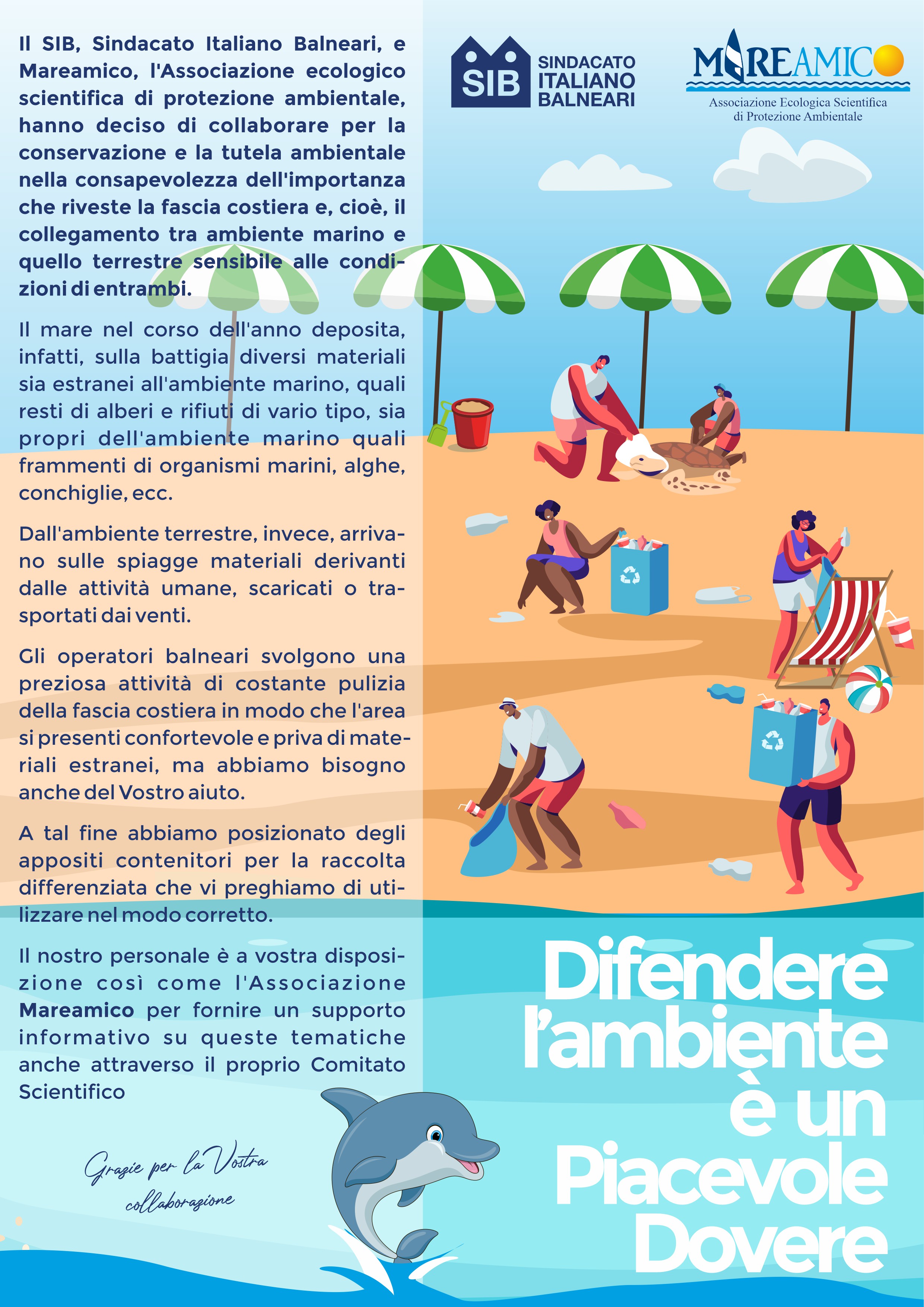Il SIB - Sindacato Italiano Balneari, aderente a FIPE-Confcommercio, e Mareamico - Associazione ecologico scientifica di protezione ambientale, hanno siglato un Protocollo di Intesa per collaborare alla conservazione e alla tutela ambientale.